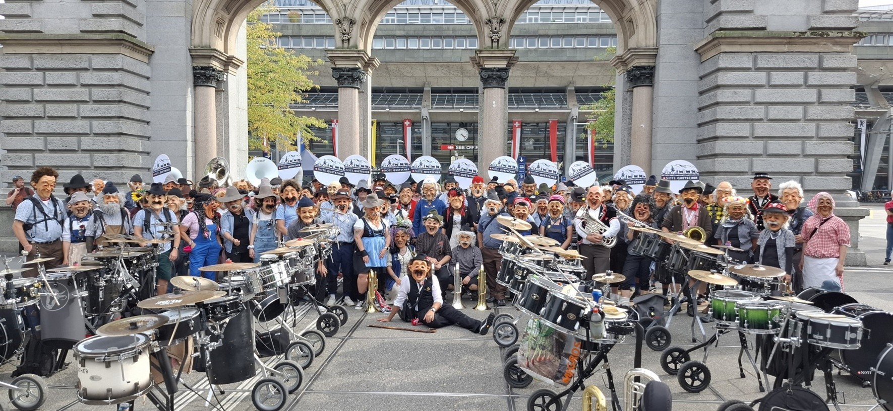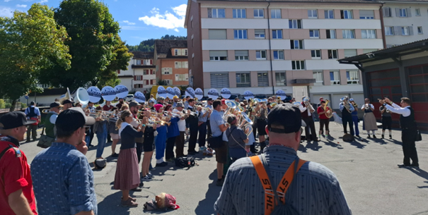 Für ihren musikalischen Leckerbissen, wurde die Formation mit einem unvergesslichen Applaus belohnt. Anschliessend hiess es wieder «Masken auf» und es wurde zum letzten Konzertplatz an diesem Tag marschiert. Alle liefen Quer durch die Stadt, ehe man sich geschlossen wieder auf dem Bahnhofsplatz traf. Hier wurden auch Ehemalige und Ehrenmitglieder begrüsst, und man konnte einen kurzen schwatz halten ehe Reni noch einmal alles von uns abverlangte. Um 16:30 Uhr hiess es noch einmal die Zuschauer, Freunde, und Ehrenmitglieder zu begeistern. Die Freude und das leuchten in den Augen der Zuhörer/innen sowie Komplimente entgegennehmen, hiess, dass man alles richtig gemacht hatte an diesem schönen Tag. Zum Schluss durfte das obligatorische Jubi Foto nicht fehlen.