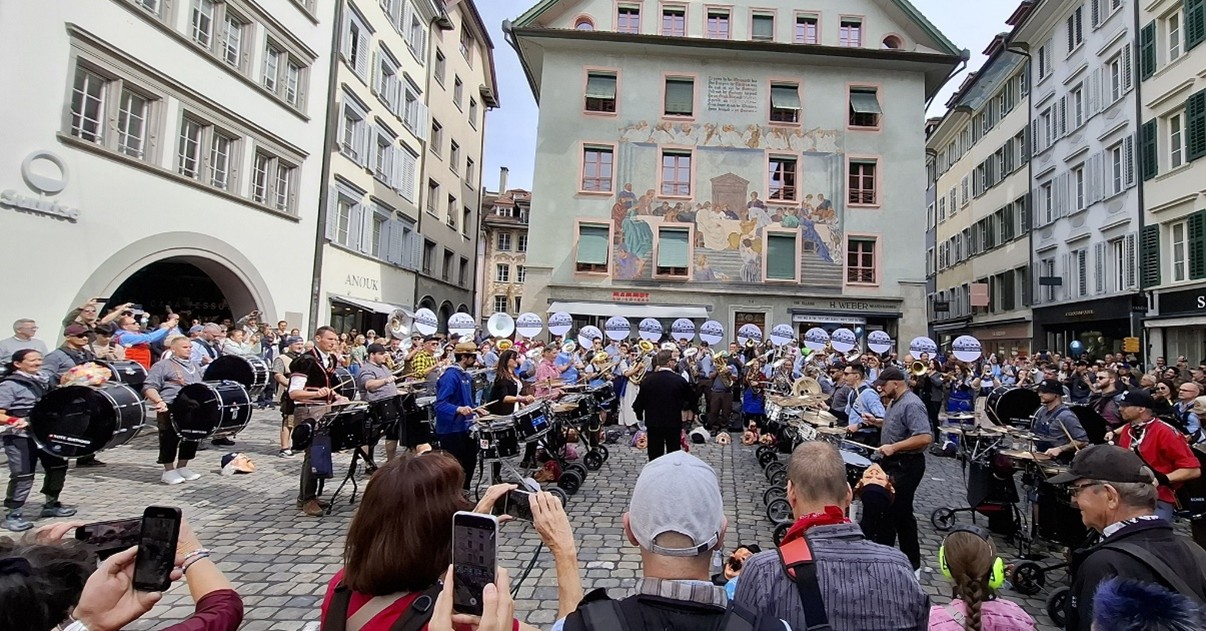 Die erste Musikalische Hörprobe fand um 13:00 MEZ auf dem Weinmarkt in der Luzerner Altstadt statt. Die grosse Musikformation zog rasch eine beachtliche Menschenmenge an, welche bei einem 30-minütigen Konzert, so richtig was auf die Ohren bekamen. Der verdiente Applaus sollte nur der Anfang sein, der täglichen Tour durch das schöne Luzern.