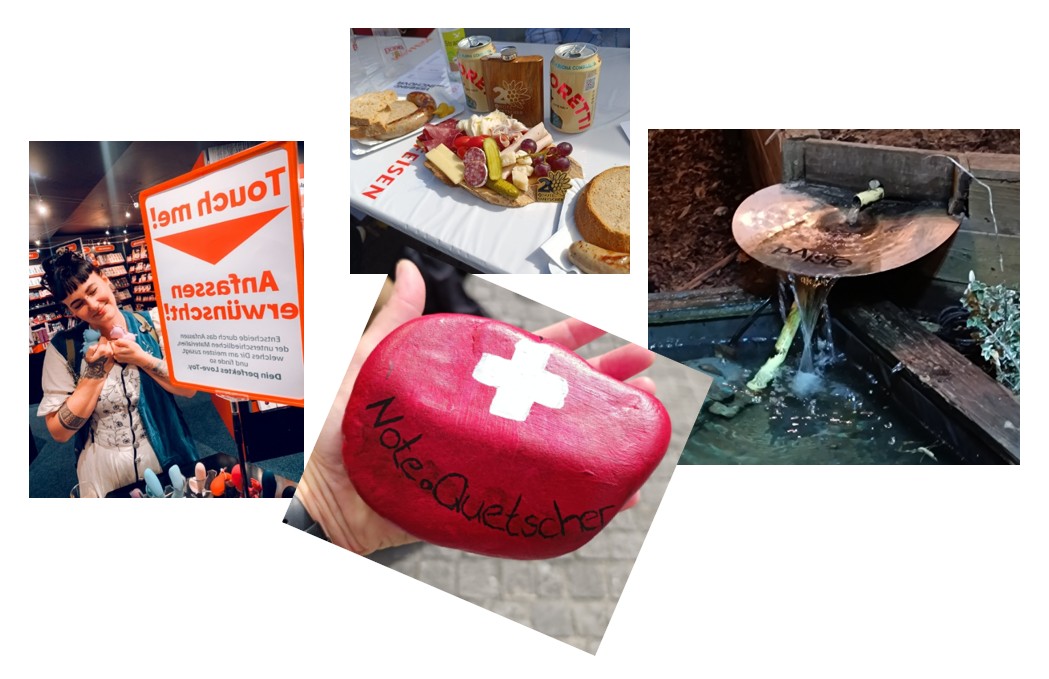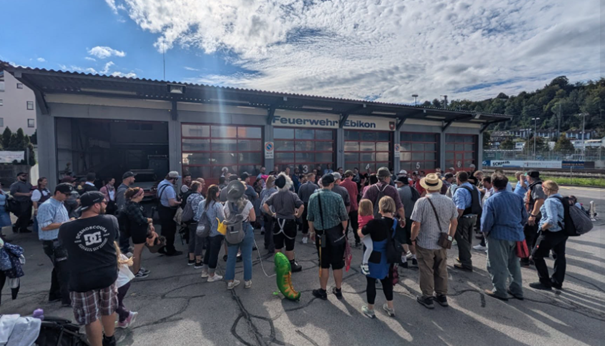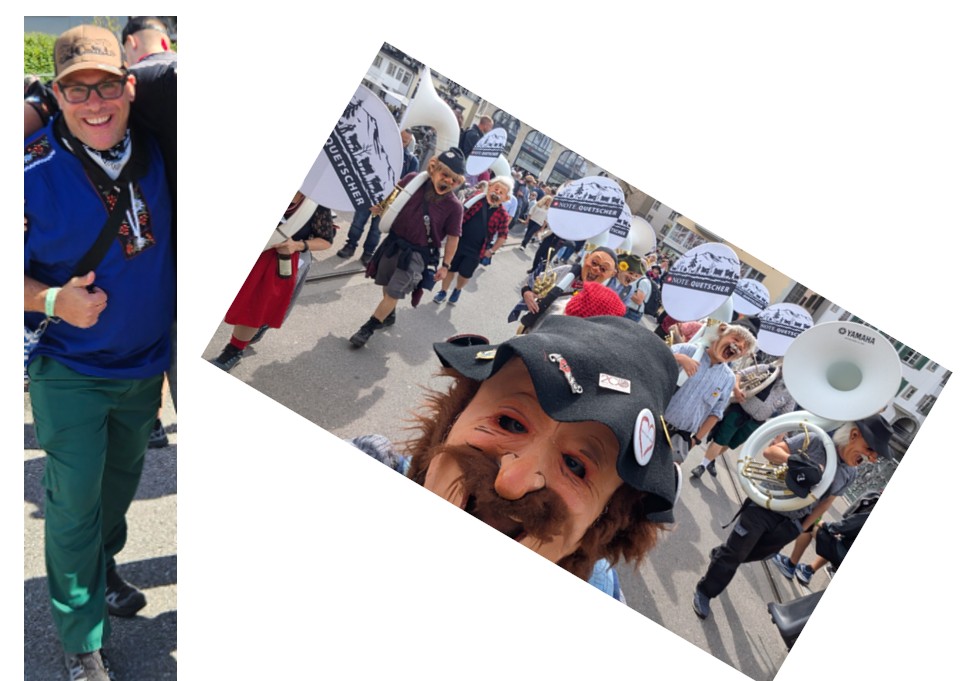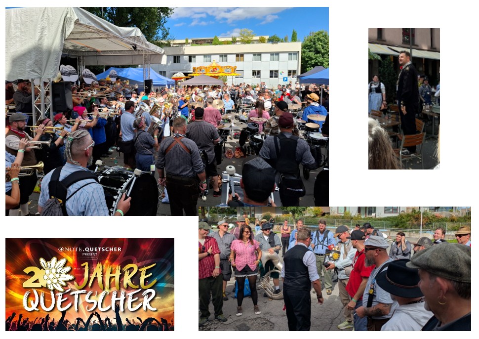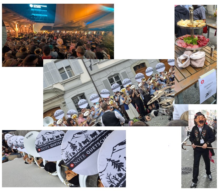Der Sonntag startete mit Sonnenstrahlen, und beim Zmorge konnte man doch die Müdigkeit beim einen oder anderen erkennen. Aber gut gestärkt, mit allem was dazugehört, (die einen geben sich auch mit einem Gin Tonic zufrieden) 😉 durften wir Quetscher in die zweite Jubi hälfte starten. Die grossen Instrumente konnte man im Instrumentendepot in der Schüür abholen, sowie nach und nach wurde in den Hotels ausgecheckt, und die Reise an diesem schönen Tag führte uns an die «Äbiker Chilbi». Treffpunkt war beim Feuerwehrmagazin um 12:00 Uhr. Die Quetscher Familie wurde wieder durch Reni herzlich begrüsst, und es wurde in den Vortagserinnerungen geschwelgt. Nach kurzem einspielen, hiess es schnell wieder Abmarsch zum Konzertplatz, wobei sich der Weg dorthin als etwas länger herausstellte aufgrund Platzverhältnisse, und die Quetscher Sonne Ihren Beitrag auch noch dazu leistete.